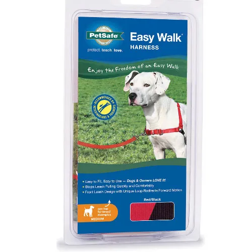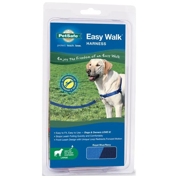 Some pups just donโt understand whoโs in charge of walks, so they drag and pull their people behind them. The PetSafeยฎ Easy Walkยฎ Harness was created by a veterinary behaviorist over 15 years ago to stop light to moderate pulling. It puts pet-parents in control of the leash and is recommended by vets and trainers. The patented front clip d-ring with martingale loop reduces leash pulling by steering your dog and provides more control of your walks. The quick-snap shoulder and belly straps allow you to fit the harness in just a few minutes. Our perfect-fit guarantee ensures it will fit pooches of all proportions. And, if your furry friend decides to turn the harness into a chew toy, we have a 1-year chew damage replacement policy for a minimal fee.
