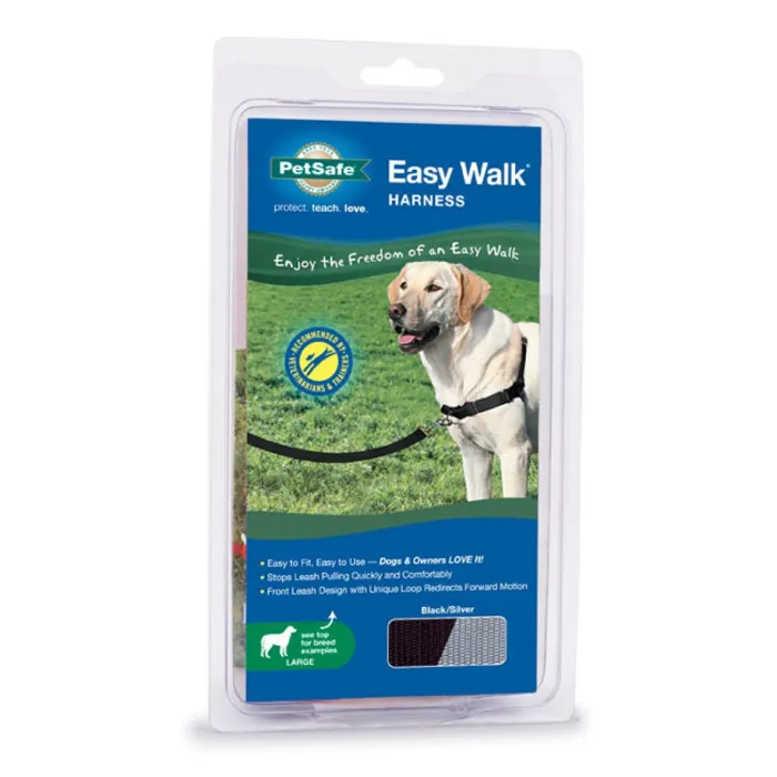 Some pups just donโt understand whoโs in charge of walks, so they drag and pull their people behind them. The PetSafeยฎ Easy Walkยฎ Harness was created by a veterinary behaviorist over 15 years ago to stop light to moderate pulling. It puts pet-parents in control of the leash and is recommended by vets and trainers. The patented front clip d-ring with martingale loop reduces leash pulling by steering your dog and provides more control of your walks. The quick-snap shoulder and belly straps allow you to fit the harness in just a few minutes. Our perfect-fit guarantee ensures it will fit pooches of all proportions. And, if your furry friend decides to turn the harness into a chew toy, we have a 1-year chew damage replacement policy for a minimal fee.