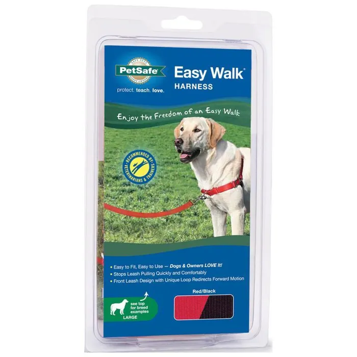 Some pups just donโt understand whoโs in charge of walks, so they drag and pull their people behind them. The PetSafeยฎ Easy Walkยฎ Harness was created by a veterinary behaviorist over 15 years ago to stop light to moderate pulling. It puts pet-parents in control of the leash and is recommended by vets and trainers. The patented front clip d-ring with martingale loop reduces leash pulling by steering your dog and provides more control of your walks. The quick-snap shoulder and belly straps allow you to fit the harness in just a few minutes. Our perfect-fit guarantee ensures it will fit pooches of all proportions. And, if your furry friend decides to turn the harness into a chew toy, we have a 1-year chew damage replacement policy for a minimal fee.