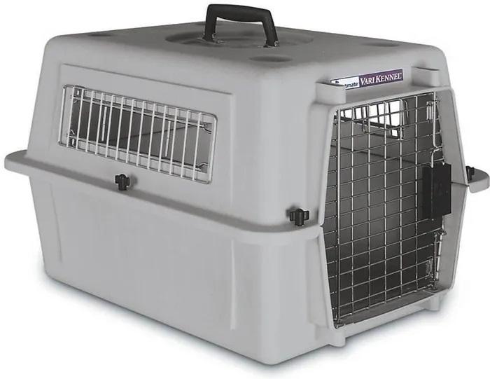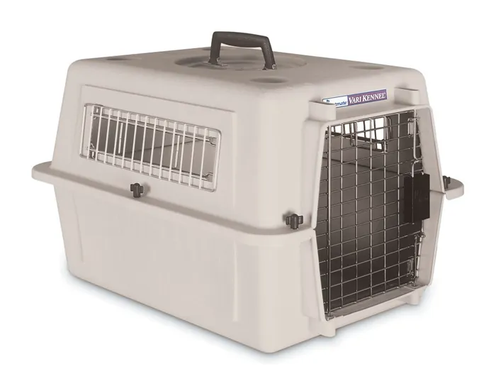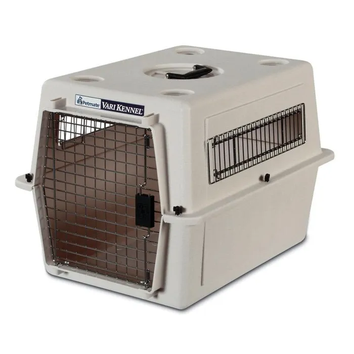 Perfect for housebreaking, the Petmate Vari Kennel is ideal for training and traveling. Features include tough durable construction with easy-open squeeze latch, vents on side walls, interior moat to keep pets dry and tie-down strap holes on the perimeter for zip-tie installation and extra security during airline travel. Vari Kennels in sizes 19" and 24" offer a built-in compartment cover for added storage of treats or other pet needs and the seatbelt loop is a notch in the top of the kennel so you can secure it in a car seat. This Petmate kennel is easy-to-assembly--no tools required. Pet parents should always confirm the airline travel requirements for each trip. Made in the USA. Small: 21 X 16 X 15 for cats and dogs up to 15 lbs