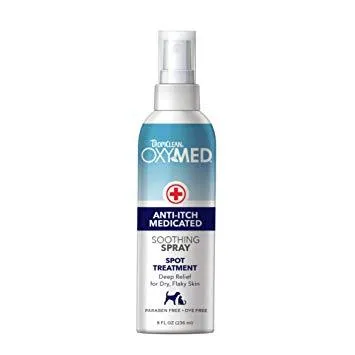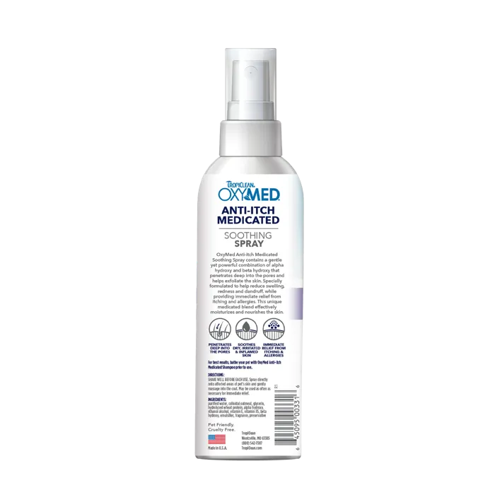 No problem getting rid of the itchies with a little help from TropiClean! OXY-MED Anti-Itch Spray provides cats and dogs with fast-acting itch relief from the most common itch contributors: hot spots, flea bites, flaking, seborrhea, and more. Added oatmeal helps soothe and moisturize the skin. TropiClean OXY-MED Anti-Itch Spray is safe to use any time Fido or Fluffiest lifts a leg to scratch.
