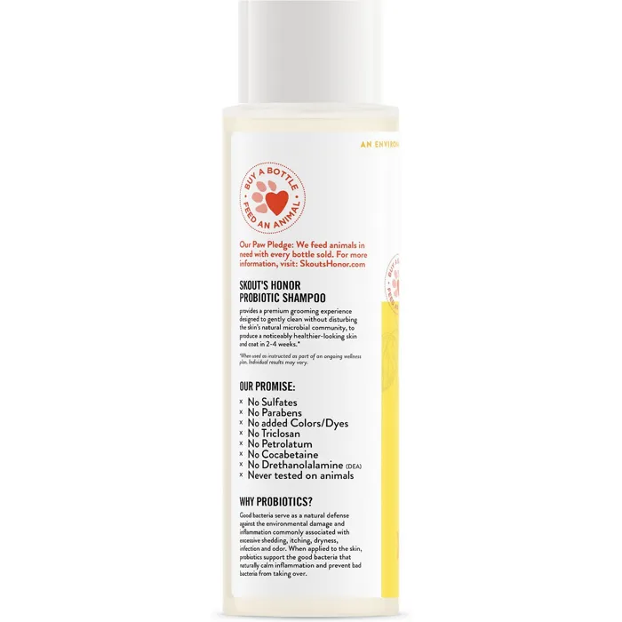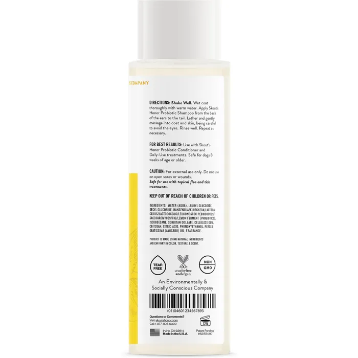 Gently cleanse your furry friendโs skin and coat with Skoutโs Honor Probiotic Honeysuckle Pet Shampoo! This probiotic formula is specially made with avocado oil and is designed to improve your petโs skin and coat by combating shedding, dryness, itching, hot spots and odor. This 98.5% natural shampoo is paraben-free and sulfate-free, PH-balanced for dogs and contains conditioning omega-3s leaving fur silky and smooth. Restore the balance back into your palโs skin and coat the eco-friendly way with Skoutโs Honor!