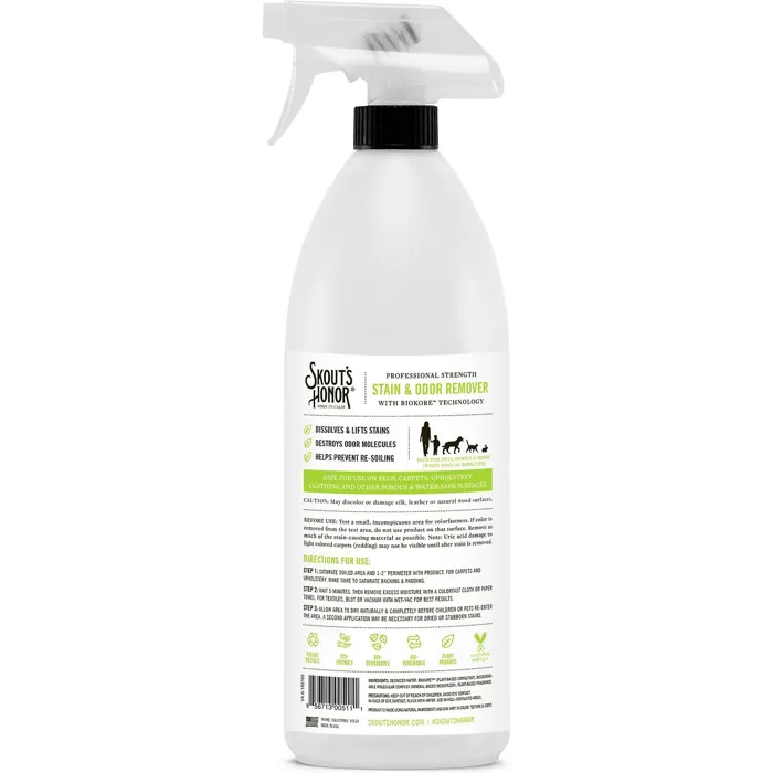 Keep your home clean with Skout's Honor Professional Strength Stain & Odor Remover. This hard-working spray performs fast to remove messes such as urine, feces, blood, mud, grease and even wine! The BioKore technology breaks down the stain while the odor eliminating technology destroys those pungent molecules for a fresh clean scent. Together, these eco-friendly solutions will keep your home unstained and ready for the next slip-up.