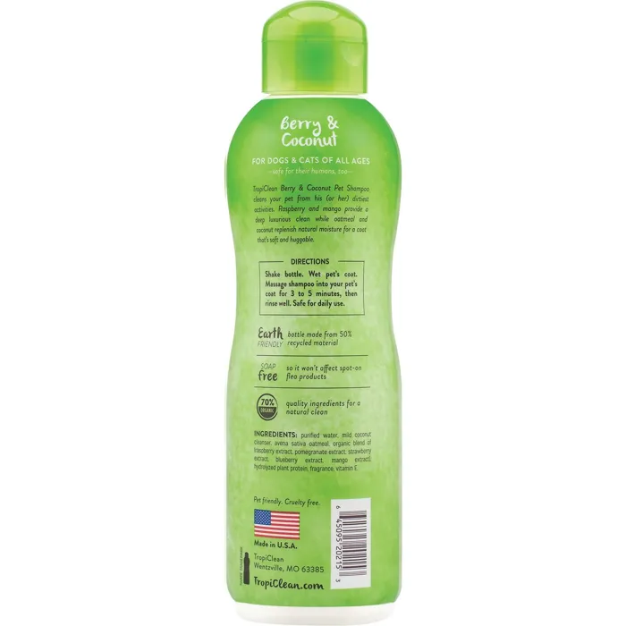 It doesn't take long for a playful pet to start to stink, but lucky for you, TropiClean Deep Cleaning Berry & Coconut Dog & Cat Shampoo makes it take even less time for them to smell like berries! Itโs a deep-cleaning, all-natural shampoo that doesn't contain any soap or common skin irritants. Raspberry helps take the stink away while oatmeal and coconut work to replenish moisture. Natural proteins and Vitamin E leaves your pal with healthy skin and a soft, shiny, luxurious coat that smells great, too.