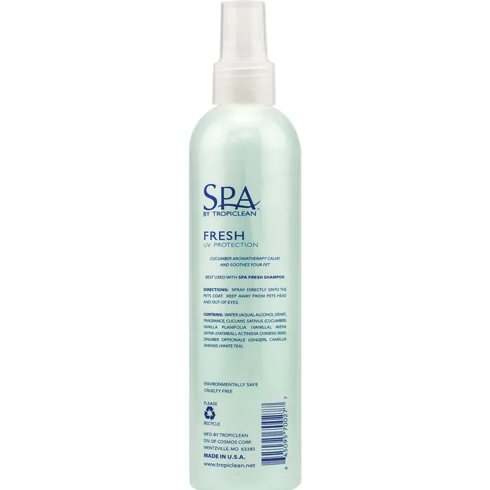 Hey, the home spa treatment's not just for people; a pup's gotta feel good, too! Natural ingredients like cucumber and oatmeal in TropiClean Spa Fresh Cologne help hydrate and soothe your pal's itchy skin while ginger and kiwi gives him a fresh, energetic scent. An added UV protector blocks damaging rays from the sun to keep your pup safe during all-day play at the park.