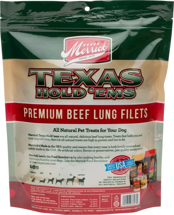 Merrick's Texas Hold'emsรฅรare a wonderful treat for the love of your life, your dog. These treats are high in protein and help provide the energy that your dog needs. Puppies to Senior dogs equally enjoy this treat due to its softer consistency and texture. Since these treats are more tender than most, they can be broken into multiple treats for training and rewarding. Dogs love natural treats!