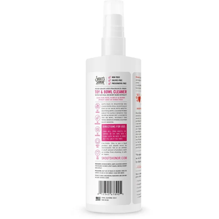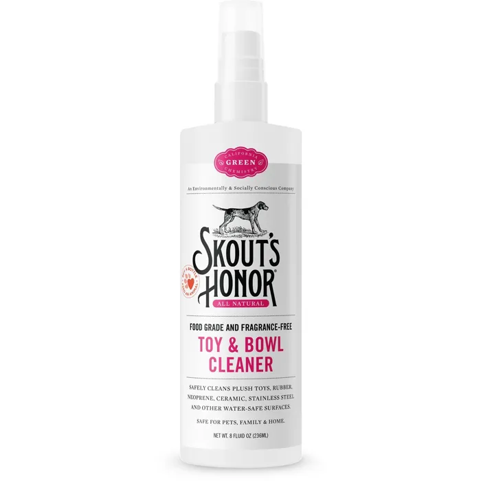 Help keep your precious petโs possessions fresh and clean with Skoutโs Honor Toy & Bowl Cleaner. Letโs face itโyou love your pet, but she is not known for her outstanding housekeeping skills and after a while her toys and bowls start to get downright gross. This 100% natural, food-grade and fragrance-free spray safely and effectively removes the icky slime and grime that can accumulate on her favorite fetch toy or food bowl. Just pry it from her paws long enough to give it a spritz and wipe with a clean cloth for a pure, fresh result. Itโs purr-fectly safe for pets and people and is recommended for use on plush, rubber, neoprene, ceramic, stainless steel and any other water-safe surface.