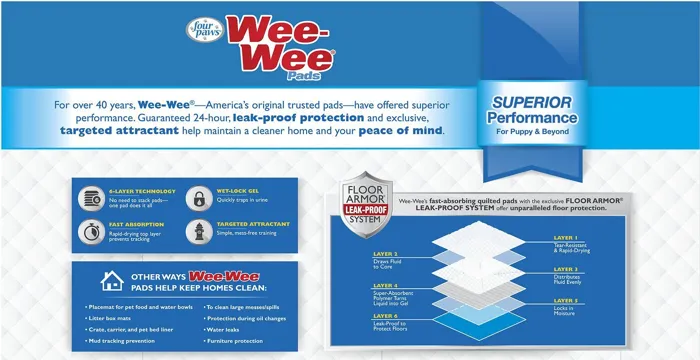 Keep your pupโs mess off of your floor with Four Paws Wee-Wee Absorbent Pads for Dogs. Featuring a 6-layer Floor Armor leak-proof system, these quilted pads are very absorbent and perfect for training both puppies and senior dogs of all sizes. They also contain a wet-lock gel that quickly traps urine with a targeted attractant to draw your dog to the pad. Oversized quilted pockets allow for maximum absorption making these pads from Four Paws as a great solution when you canโt be home.