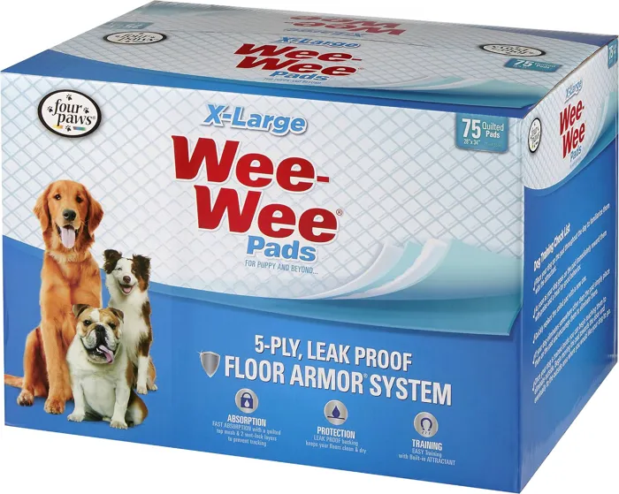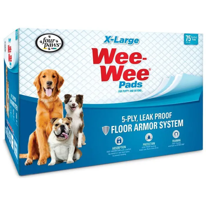 Help get your newest member of the family get used to his new surroundings with Wee-Wee Extra Large Puppy Housebreaking Pads. These training pads offer maximum absorption and are 100% leak-proof. They have 5 layers for extreme protectionโincluding 2 reinforcing layers that pull liquid under the surfaceโwhile a super-absorbent polymer core locks in liquid. An added leak-proof liner guarantees your floors stay clean and dry, making these pads from Four Paws a great alternative when you canโt be home.