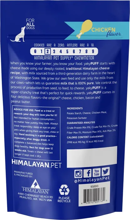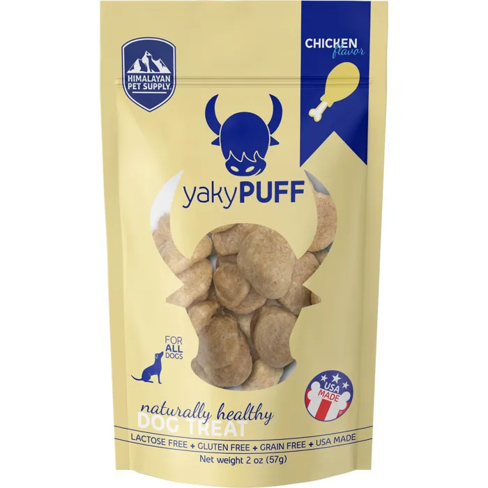 If your dog hasnโt tasted the cheesy deliciousness of a Himalayan Dog Chew, itโs time to treat him to some Yaky Puff Chicken Dog Treats. This ancient recipe uses traditional methods to create an authentic Himalayan hard cheese from skimmed milk with a dash of salt and splash of lime juice and then infuses it with chicken flavor. Itโs sun-dried, smoked and cooked into a bite-sized puff for a softer texture so itโs easier for all dogs to chew, even puppies and seniors. The result is a smoky cheese and chicken-flavored treat thatโs sure to become your dogโs new favorite reward.