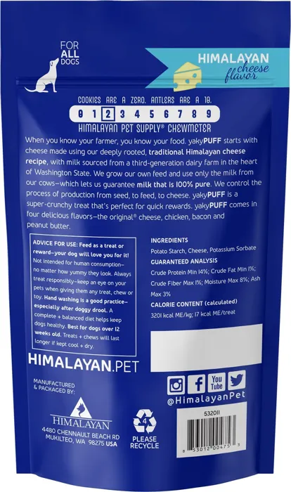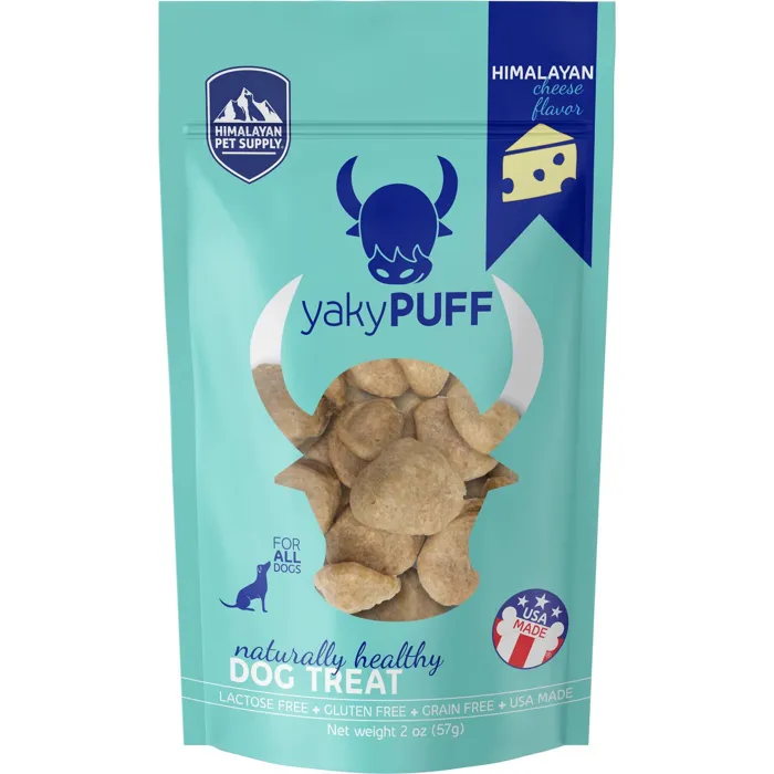 If your dog hasnโt tasted the cheesy deliciousness of a Himalayan Dog Chew, itโs time to treat him to some Yaky Puff Himalayan Cheese Dog Treats. This ancient recipe uses traditional methods to create an authentic Himalayan hard cheese from skimmed milk with a dash of salt and splash of lime juice. Itโs sun-dried, smoked and cooked into a bite-sized puff for a softer texture so itโs easier for all dogs to chew, even puppies and seniors. The result is a smoky cheese-flavored treat thatโs sure to become your dogโs new favorite reward.