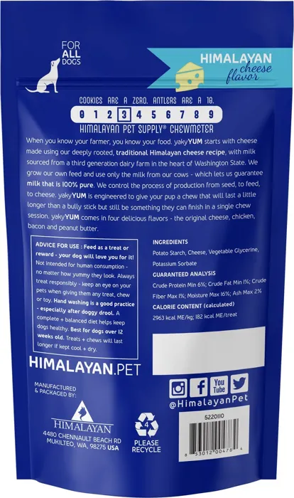 If your dog hasnโt tasted the cheesy deliciousness of a Himalayan Dog Chew, itโs time to treat him to some Yaky Yum Himalayan Cheese Dog Treats. This ancient recipe uses traditional methods to create an authentic Himalayan hard cheese from skimmed milk with a dash of salt and splash of lime juice. Itโs sun-dried, smoked and cooked into a chewy stick with a softer texture so itโs easier for all dogs to chew, even puppies and seniors. The result is a smoky cheese-flavored treat thatโs sure to become your dogโs new favorite reward.