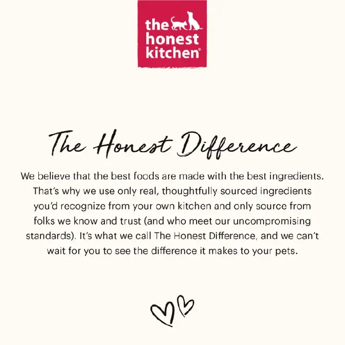 We believe that the best foods are made with the best ingredients. That's why we use only real, thoughtfully sourced ingredients you'd recognize from your own kitchen and only source from folks we know and trust (and who meet our uncompromising standards). It's what we call The Honest Difference, and we can't wait for you to see the difference it makes to your pets.