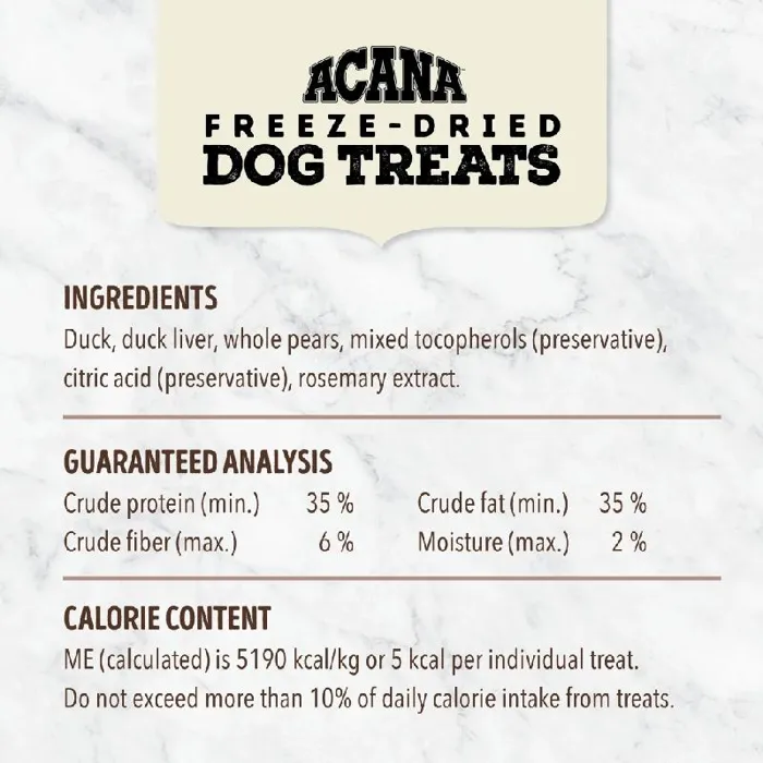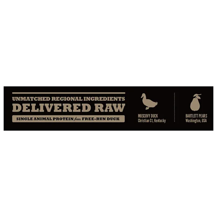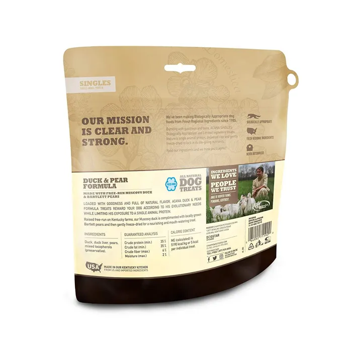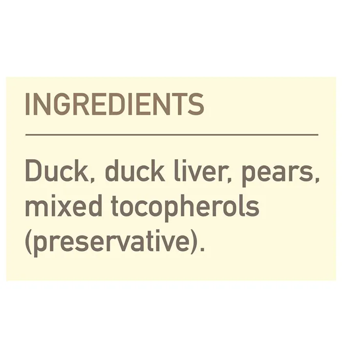 - Limited-ingredient dog treats made with free-run Muscovy duck and Bartlett pears